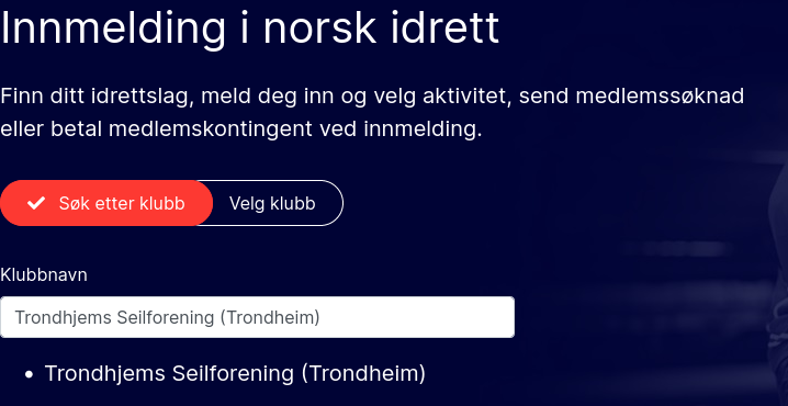 For å bli medlem må du finne seilforeningen ved dets eksakte navn. Søk etter «trondhjems seilforening». Da får du muligheten til å velge riktig medlemskapstype.