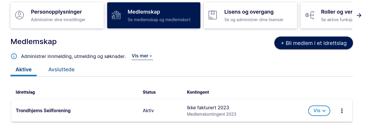 Når du er logget inn på kontoen din har du flere alternativer. Oversikt og min side. Medlemskap i menyen viser din nåværende medlemsstatus. Velg eventuell knappen «Bli medlem av et idrettslag».